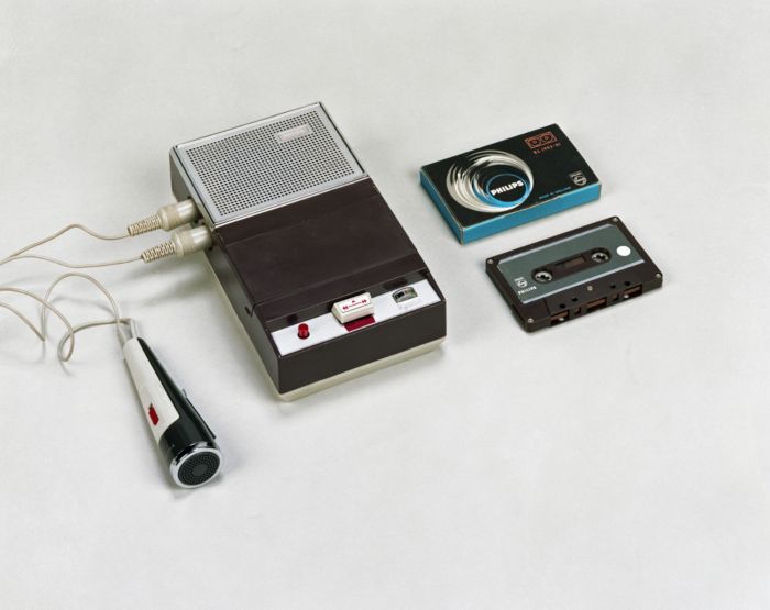 When I was about seven or eight, I discovered my parents' 'shoebox' audio Compact Cassette recorder. Audio Compact Cassettes were invented by Philips in 1963 along with, naturally enough, the first Compact Cassette recorder, to go with it. It was this recorder that my parents had. Here's a pic from a page on the company's website which briefly describes the product:
